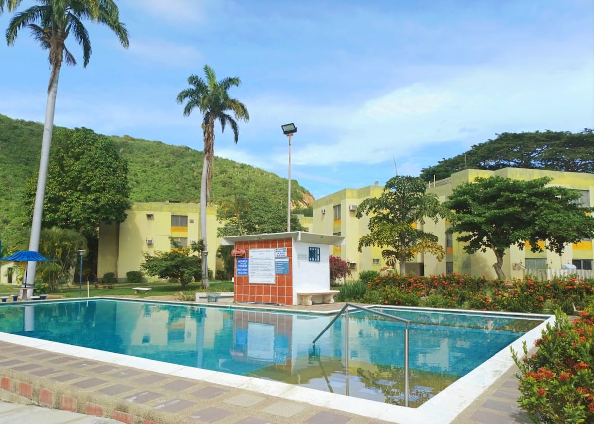 Apartamento a pocos pasos de la Bahía de Cata. La residencia cuenta con áreas familiares, piscina, área de parrilleras, estacionamiento, parque, cancha de baloncesto y de bolas criollas. A pocos pasos de la residencia, hay una entrada directa hacia la playa (Cata), cerca de varios negocios de comida.