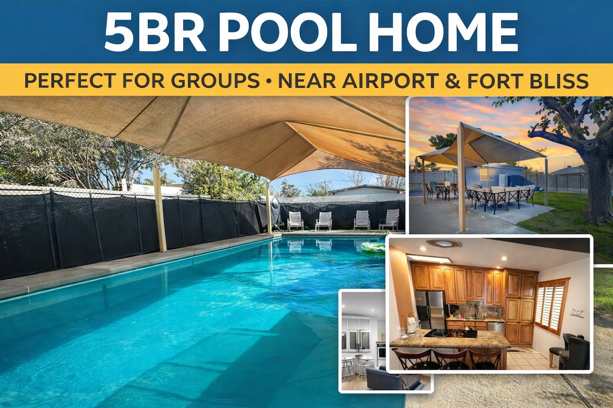 Casa elegante y completamente remodelada con piscina: ¡8 plazas! Disfruta de una **recién remodelada** casa de 4 dormitorios en El Paso, perfecta para familias y grupos pequeños. Relájate junto a la ** piscina privada ** o relájate en los espacios modernos. Convenientemente ubicado cerca de tiendas, restaurantes y atracciones. ✔ **Capacidad para un máximo de 8 huéspedes** ✔ ** Piscina privada y servicios modernos ** ✔ **Máximo 3 vehículos: estacionamiento en la entrada y en el garaje. ❌ **No se permiten eventos, reuniones ni fiestas** ¡Reserva ahora para una estadía cómoda!