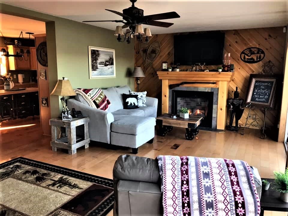 WINTERFELL, NH: ¡CABAÑA DE 4 DORMITORIOS Y 2 BAÑOS CON PAREDES DE TRONCOS DE CEDRO, SU “BASE DE OPERACIONES” PARA SUS AVENTURAS! CON APROXIMADAMENTE 186 M², CUENTA CON UNA AMPLIA COCINA TOTALMENTE EQUIPADA, UNA GRAN SALA CON INCREÍBLES VISTAS A TRAVÉS DE 3 GRANDES PUERTAS CORREDIZAS DE VIDRIO, 4 DORMITORIOS Y 2 BAÑOS. TV DE PANTALLA PLANA GRANDE EN LA SALA DE ESTAR SOBRE LA CHIMENEA Y EN EL DORMITORIO PRINCIPAL DE LA PLANTA SUPERIOR SOBRE LA CHIMENEA ELÉCTRICA - “Firestick”/Smart TV - Utiliza tus propios códigos de acceso para las aplicaciones de pago, wifi, fogata, parrilla, acceso a los senderos para motos de nieve desde el alojamiento; remolque para el sendero para cuatriciclos