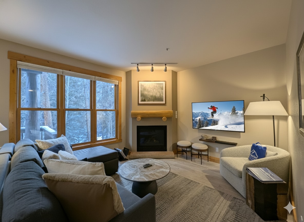 This 1 bedroom 1 bathroom cozy cottage-like condo is perfect for your stay in Keystone. Step into the comfortable living space with high ceilings and great decor. The living room features a gas fireplace, flat screen TV, queen size sleeper sofa, and glass doors opening to the private balcony containing a propane grill. Enjoy cooking delicious meals in the fully equipped kitchen and sit down at the table seating 4 people. The primary bedroom features a queen size bed and flat screen TV.