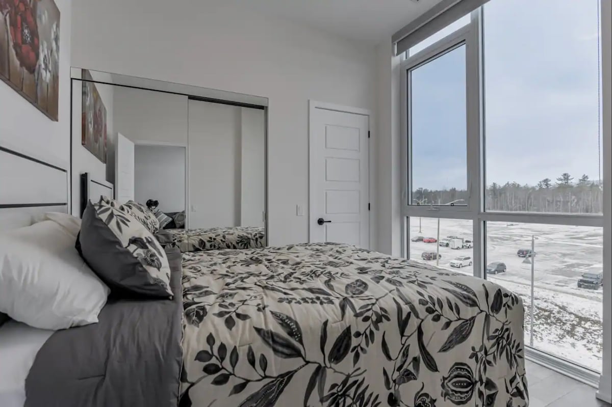 The perfect getaway an hour away from Toronto! Modern and bright fully stocked condo with a year-round hot tub, outdoor pool, fireplace, and an outdoor fire pit. Outside you are surrounded by 200 acres of nature preserve, with trails for walking and biking, golf, kayak, canoe, boat, etc. → Beach access → Underground Parking for 1 vehicle → Fully equipped + stocked kitchen → Year Round Hot Tub → Outdoor Swimming Pool