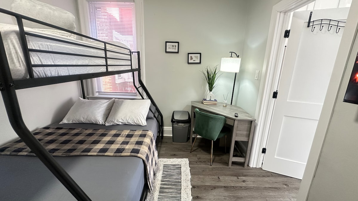 This meticulously curated Japandi-inspired studio is perfect for remote work or a peaceful retreat. The space features a cozy queen bed, small loveseat, and seating area. Enjoy high-speed internet, TV, and a writing desk for productivity. The suite includes a kitchenette with a fridge, microwave, and coffee maker. Located in a quiet, safe neighborhood, with access to a backyard fire pit for relaxation. Ideal for a calm, comfortable, and productive stay.