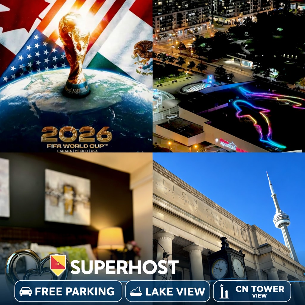 Vistas panorámicas con un gran balcón del lago Ontario, la Torre CN y el horizonte de Toronto. 3 dormitorios con capacidad para 6/7 personas. 2 camas tamaño queen, 1 cama individual y un colchón hinchable con una bomba de inflado rápido. Acabados completamente nuevos. TV inteligente de 70 pulgadas en la sala de estar. Aparcamiento incluido. A poca distancia a pie de Harbour Front, la Torre CN, el Scotiabank Arena y mucho más. Cocina totalmente equipada, camas lujosas.