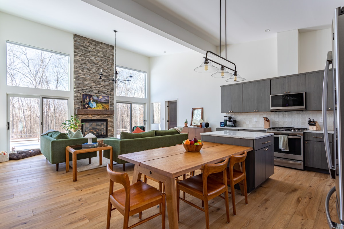 Un moderno refugio de 3 dormitorios/2 baños en Catskills en 6 acres privados con bañera de hidromasaje y chimenea. Ubicada en una colina, esta casa de un solo nivel ofrece serenidad, vistas panorámicas, decoración moderna de mediados de siglo y comodidad, ideal para viajes de chicas, parejas y familias. Servicios: Chimenea Jacuzzi Mini ping-pong Dart Board Wifi de alta velocidad Narrowsburg ofrece: - Restaurantes y tiendas. - Spas de lujo y yoga - Granja de alpacas - Senderismo - Mercados de agricultores -Delaware Valley Arts Alliance ¡Disfruta de lo mejor de Catskills!