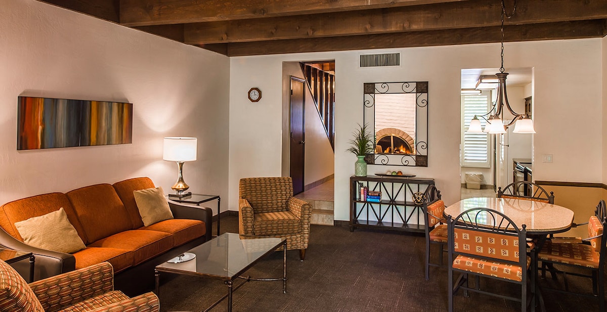 Relájese en nuestros espaciosos alojamientos con cama tamaño queen y sofá cama. El baño incluye ducha a ras de suelo y secador de pelo. Disfrute de la conveniencia de nuestra cocina completa equipada con un refrigerador, microondas, estufa, horno y cafetera. Las comodidades adicionales en la habitación incluyen televisión por cable, reproductor de DVD, caja fuerte en la habitación, plancha/tabla de planchar, teléfono y aire acondicionado. El servicio de Wi-Fi también está disponible por un suplemento.