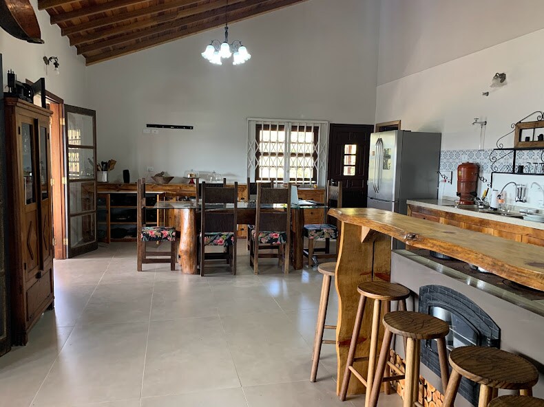 Chácara Solevante Acogedor refugio en medio de la naturaleza, perfecto para relajarse y divertirse con familiares y amigos. Amplia casa de campo con 6 suites, comedor con parrilla para acomodar a todos los huéspedes. Estufa de leña y chimenea para los días más fríos. Ambiente ideal para descansar y disfrutar. Área verde🌿 grande 🏊 Piscina Tanque de🎣 pesca con quiosco ⚽ Campo de fútbol 🏡 Perfecto para familias y grupos 🔥 Ideal para todas las estaciones 🎱 Mesa de billar 📺 Sala con TV