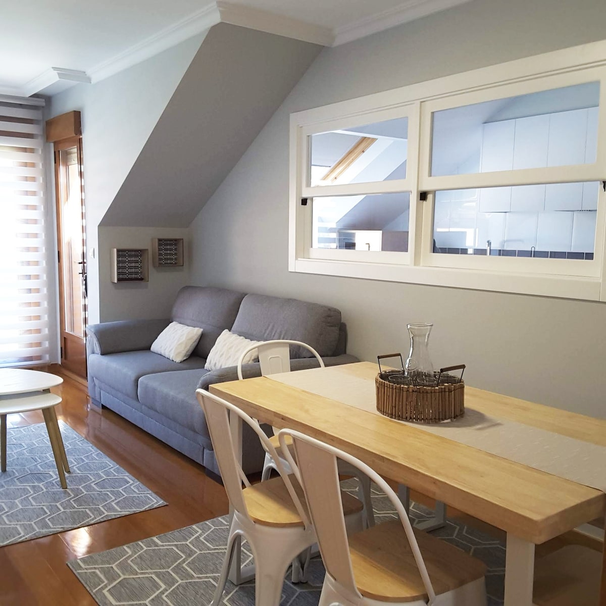 Moderno apartamento situado en el casco histórico de Marín, con vistas a la Escuela Naval Militar y Alameda Cuenta con 2 habitaciones, una doble y otra individual, careciendo de pared divisoria para conseguir mayor luminosidad, habiendo un baño que separa ambos ambientes para tener la suficiente intimidad Para cumplir con la normativa anti Covid, el acceso al apartamento se hace de manera autónoma sin necesidad de contacto entre el anfitrión y huésped (indicaciones en la guía del apartamento)