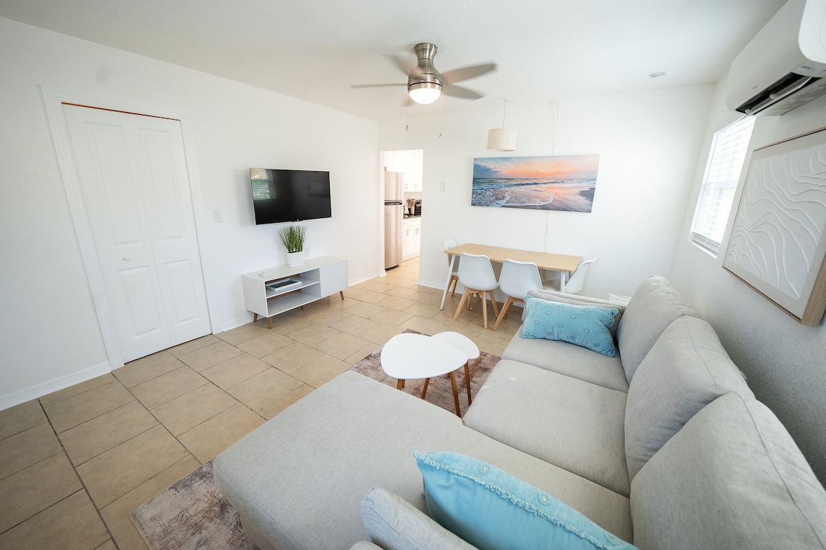 1 de 3 unidades en una villa privada junto a la playa escondida en una calle tranquila. Camina a muchos restaurantes. Todo nuevo. **Lavadora/secadora en la unidad. **Patio privado. **Cocina de tamaño completo. **Aire acondicionado silencioso sin conductos, **Estacionamiento gratuito enfrente. **Se proporcionan suministros de PLAYA. Serenidad total en este tramo secreto de playa mejor guardado, a solo unos pasos de tu puerta. La hermosa y amplia playa recorre kilómetros. 1 dormitorio con cama tamaño queen súper cómoda, sala de estar separada, sofá emergente muy cómodo. 2 unidades más disponibles; 1 dormitorio y 2 dormitorios.