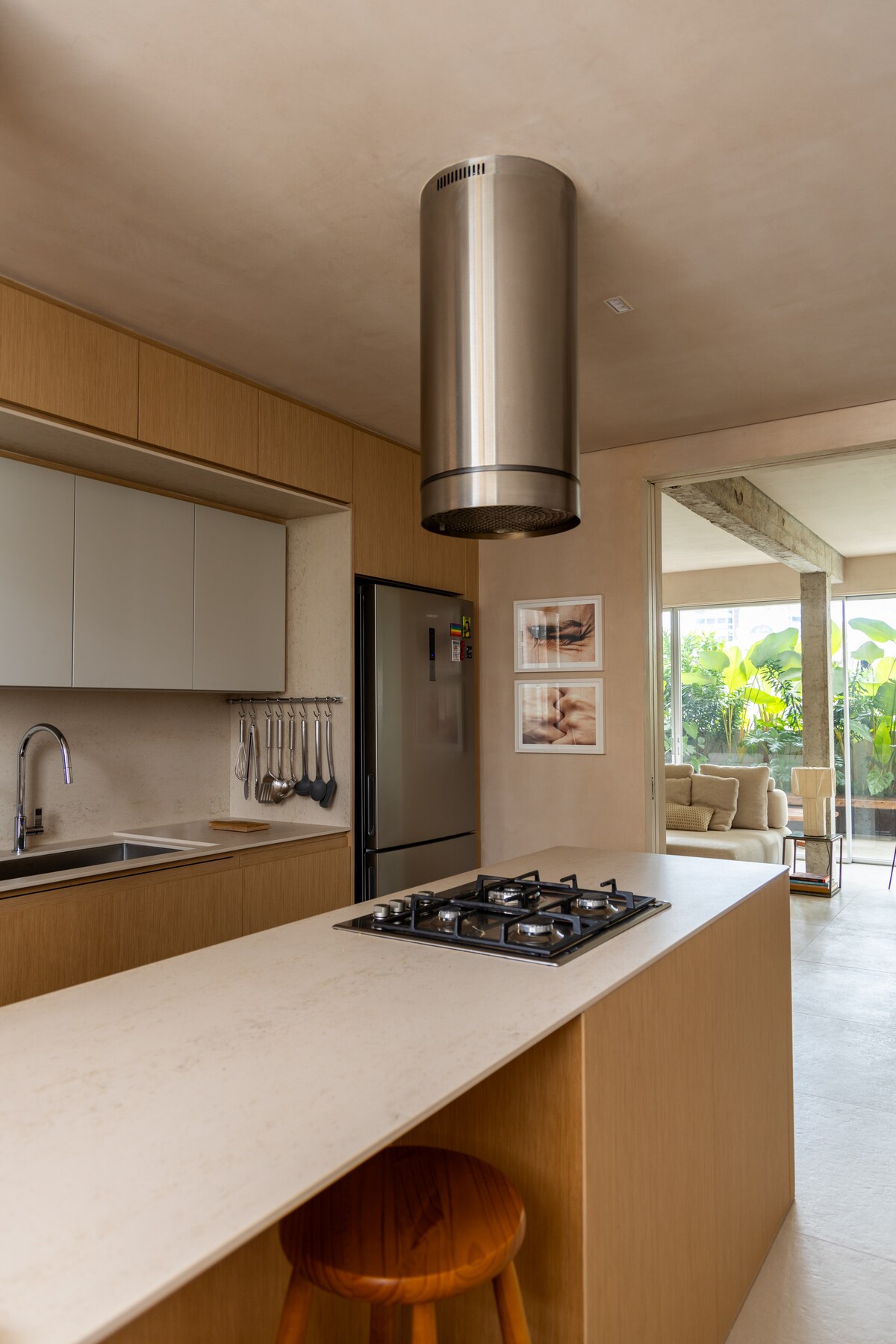 No topo do Copan, de frente para a Avenida Ipiranga, este estúdio de 44m² nos convida a flutuar sobre a paisagem de São Paulo. A sensação de leveza vem do piso em pastilhas, que, após a reforma, se estende por todo o interior do apartamento, criando continuidade visual e integração com o breeze característico da fachada norte.