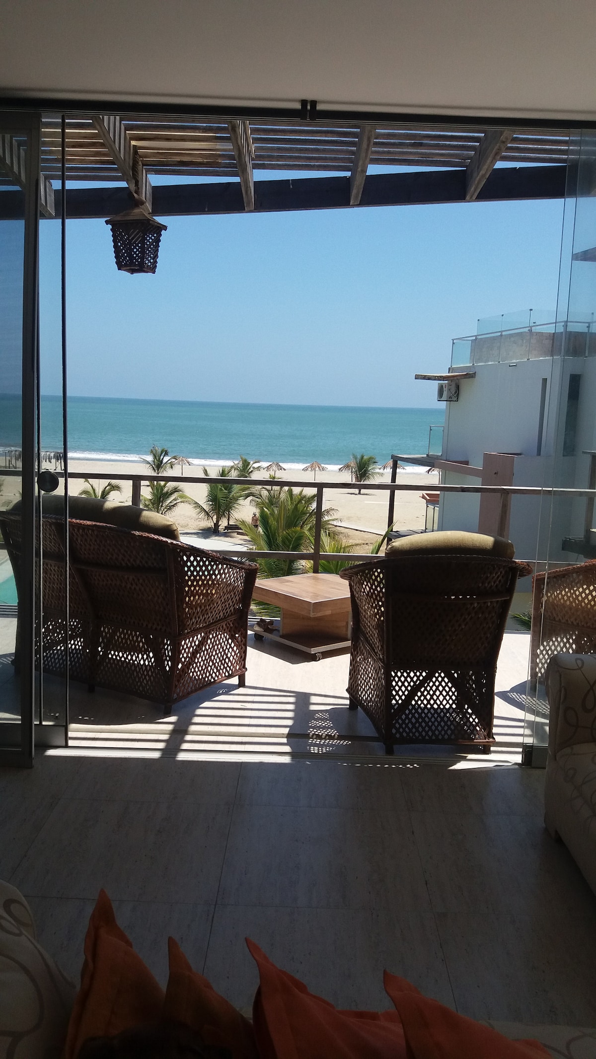 Amplio departamento frente al mar, en condominio privado, seguro y familiar, con vista a la piscina del condominio y al mar. Aire acondicionado en las 3 habitaciones, esencial para un descanso cómodo en esta zona costera, además de estacionamiento gratuito dentro del condominio y WiFi. Ideal para familias y grupos de hasta 10 personas que buscan confort, seguridad y tranquilidad. Playa tranquila sin rocas y todas las comodidades para disfrutar al máximo.Linda Piscina en área comun