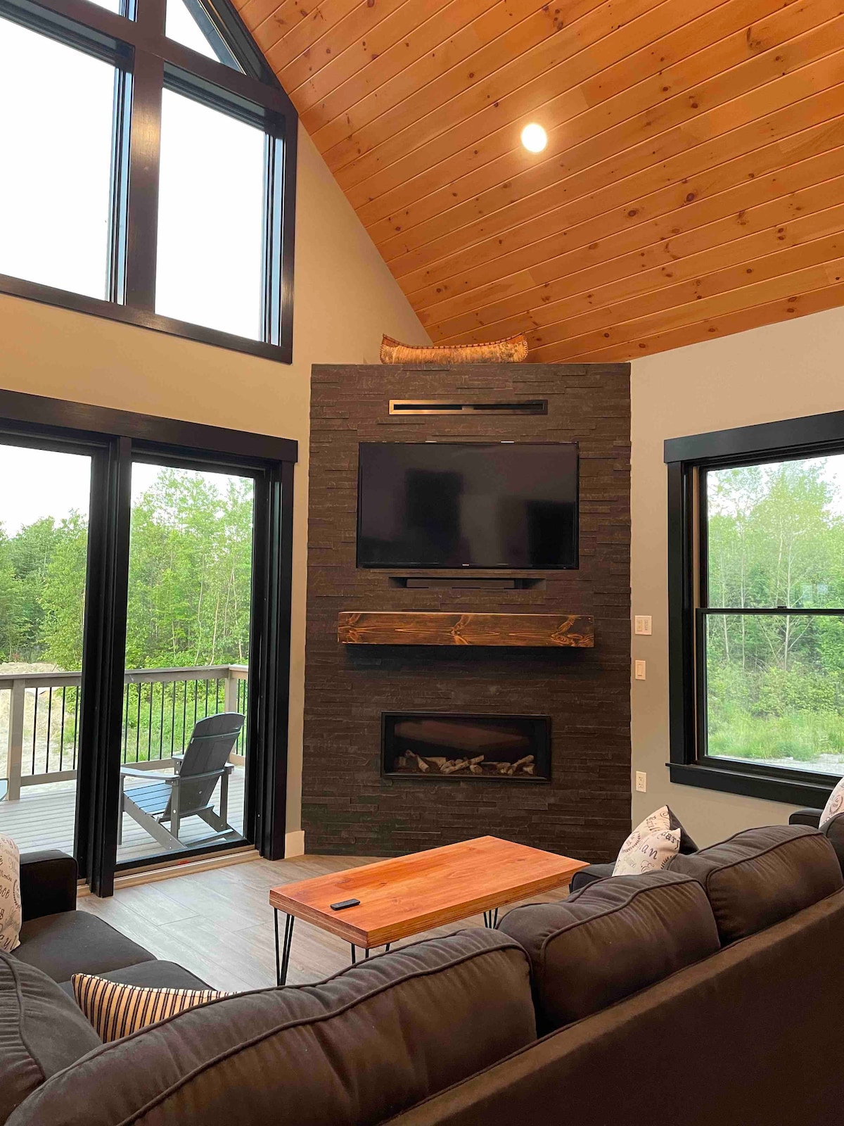 This exquisite log apartment offers a one of a kind luxury experience with a full designer kitchen/living area with a queen sofa bed, a full bathroom with a steam shower and soaking tub, and a luxurious private master bedroom with a gas stone fire place and a balcony which overlooks a 140’ private beach on the Saco River.