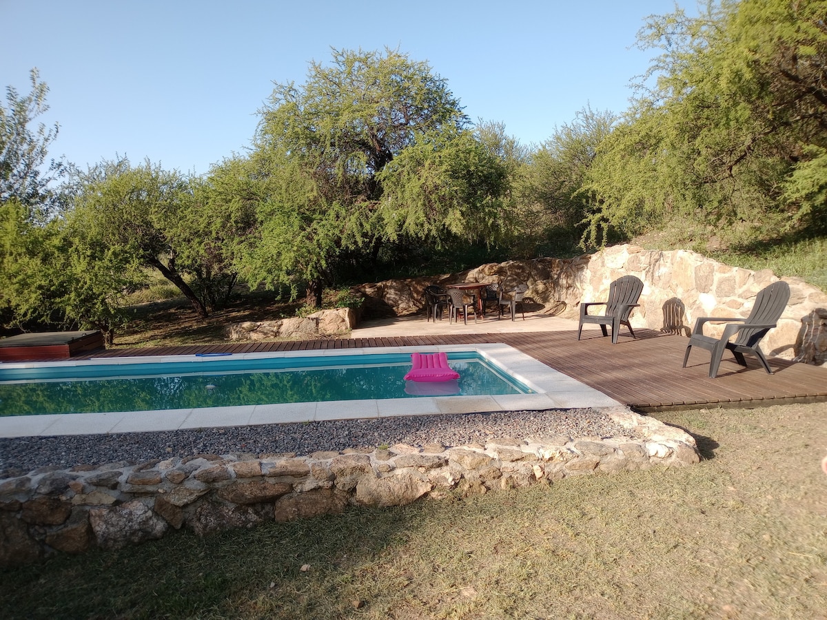 Hola, somos un matrimonio que disfrutamos de un espacio único, con unas vistas espectaculares al cerro Champaquí y al lindero, como a todo el valle en general. Un parque de 6.400 mts2 y una piscina de 9x4,5 con solárium húmedo e hidro. Te ofrecemos una cabaña independiente de nuestra casa con baño privado y con su propia entrada y espacio para estacionar. Tenemos mascotas por lo que no podemos recibir huéspedes con mascotas. Te ofrecemos la calidez de nuestro entorno con acceso a la piscina.
