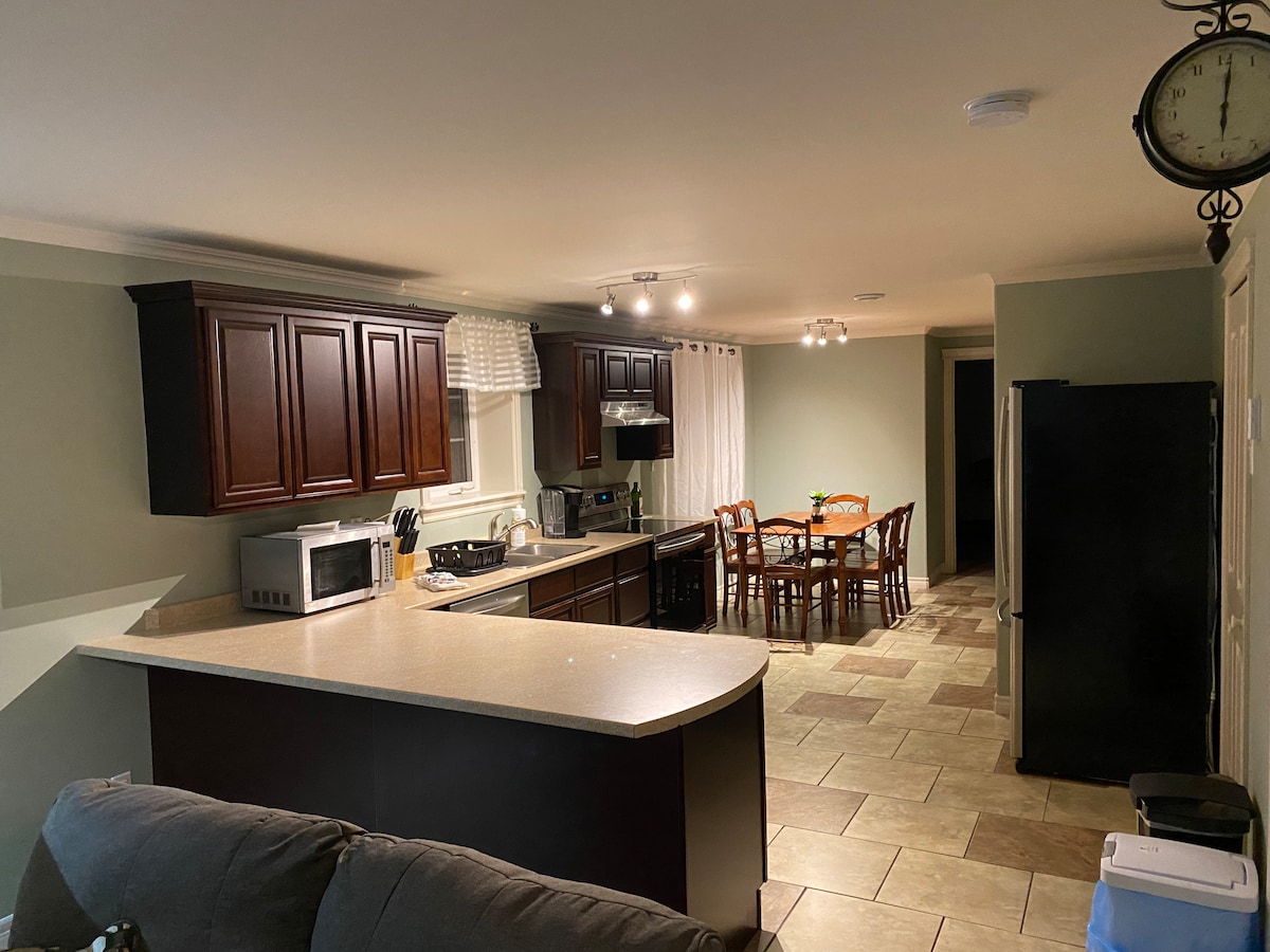 Relájate en este alojamiento APTA PARA PERROS. Esta espaciosa unidad de alquiler tiene dormitorio privado y sofá cama tamaño queen si es necesario. La COCINA PEQUEÑA ofrece una nevera de bar, fregadero, microondas, tostadora y hervidor de agua junto con todos los platos necesarios. La prensa francesa proporcionada es perfecta para el café de origen local. Esta acogedora y cómoda suite en el sótano también tiene algunas bonificaciones adicionales, como una mesa de hockey de aire, un tocadiscos y una cinta de correr. Cozy Corner también ofrece estacionamiento privado y entrada con cerradura digital.