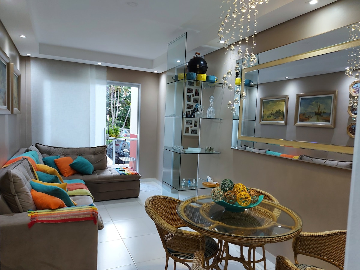 Puedes elegir una cama doble tamaño king o dos camas individuales, además de un colchón adicional. Estufa de inducción y varios utensilios de cocina, todo nuevo. Estamos en el corazón de Granja Viana , cerca de muchos restaurantes. En el edificio tenemos lavandería de autoservicio, gran garaje, piscina con aire acondicionado, gimnasio y minimercado. Estructura hotelera.