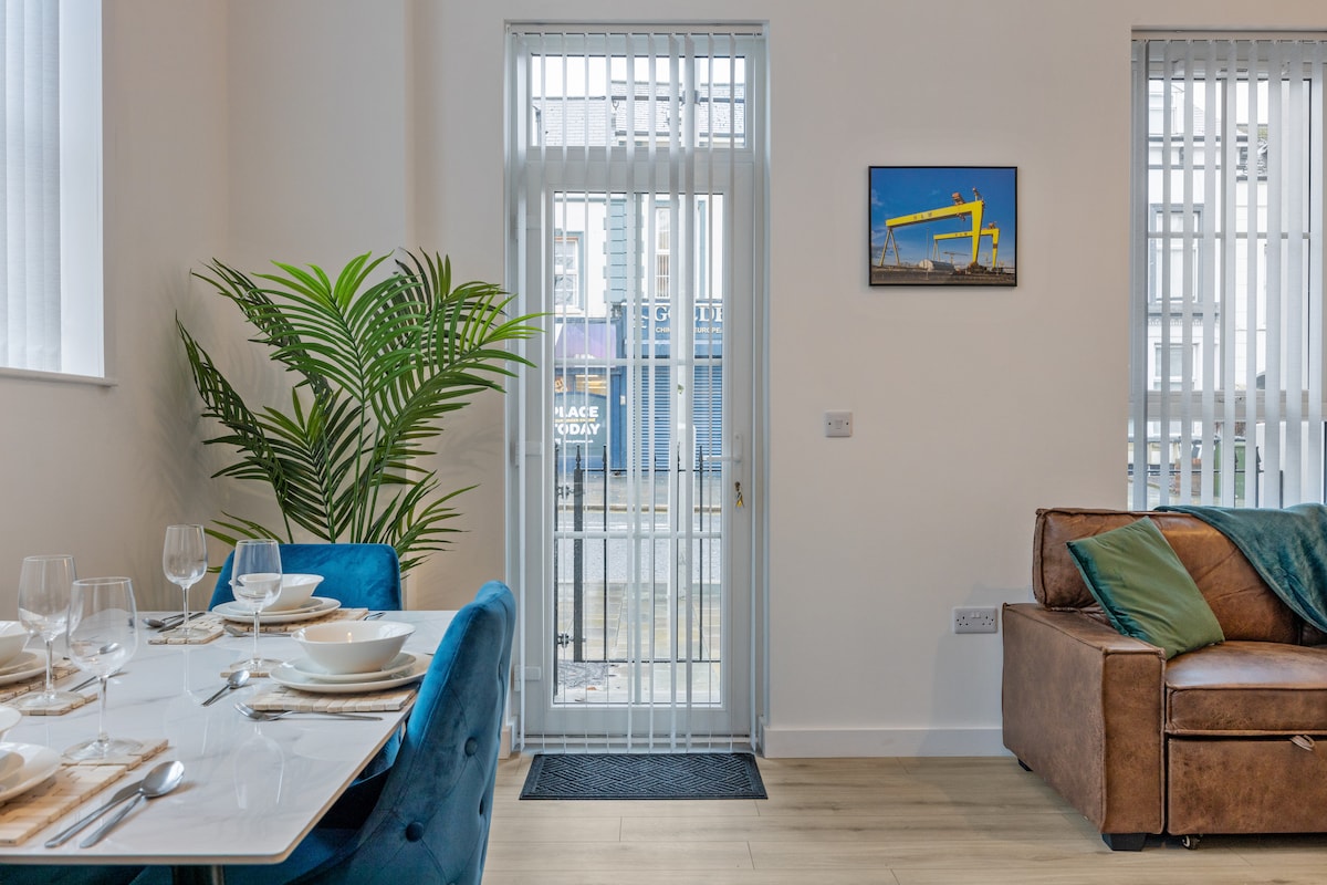 Apartamento de 2 dormitorios hermoso y extremadamente cómodo en el centro de Belfast. El apartamento reformado es perfecto para turistas y compradores. Certificado por la Junta de Turismo de Irlanda del Norte. - Check-in/out de autoservicio. - Información proporcionada sobre recomendaciones y atracciones locales. - Estacionamiento hasta para 2 coches. - Parque infantil cercano. - Cuna de viaje y trona incluidas. - Todo es accesible a pie. - Té y café incluidos. - Banda ancha y Netflix incluidos. - Cerca de tiendas/restaurantes. - A 5-10 minutos a pie del ayuntamiento y la zona comercial.