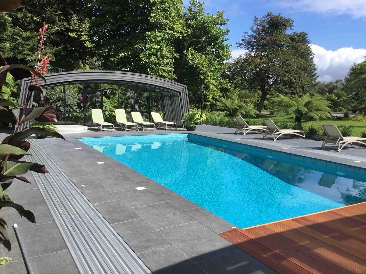 Como se ve en THE IRISH ROAD TRIP.COM, ELEGANTES AIRBNBS CON PISCINAS Casa de invitados en el anillo de Kerry y la Wild Atlantic Way situada en 10 acres de bosques y jardines tropicales. Somos una finca de jardín privado con vistas a la bahía de Kenmare conectada a kilómetros de senderos a través de bosques, prados y jardines tropicales. La casa del cochero es espaciosa y muy cómoda, con 2 dormitorios con baño privado, cocina y una gran sala de estar con TV de pantalla plana y estufa de leña.