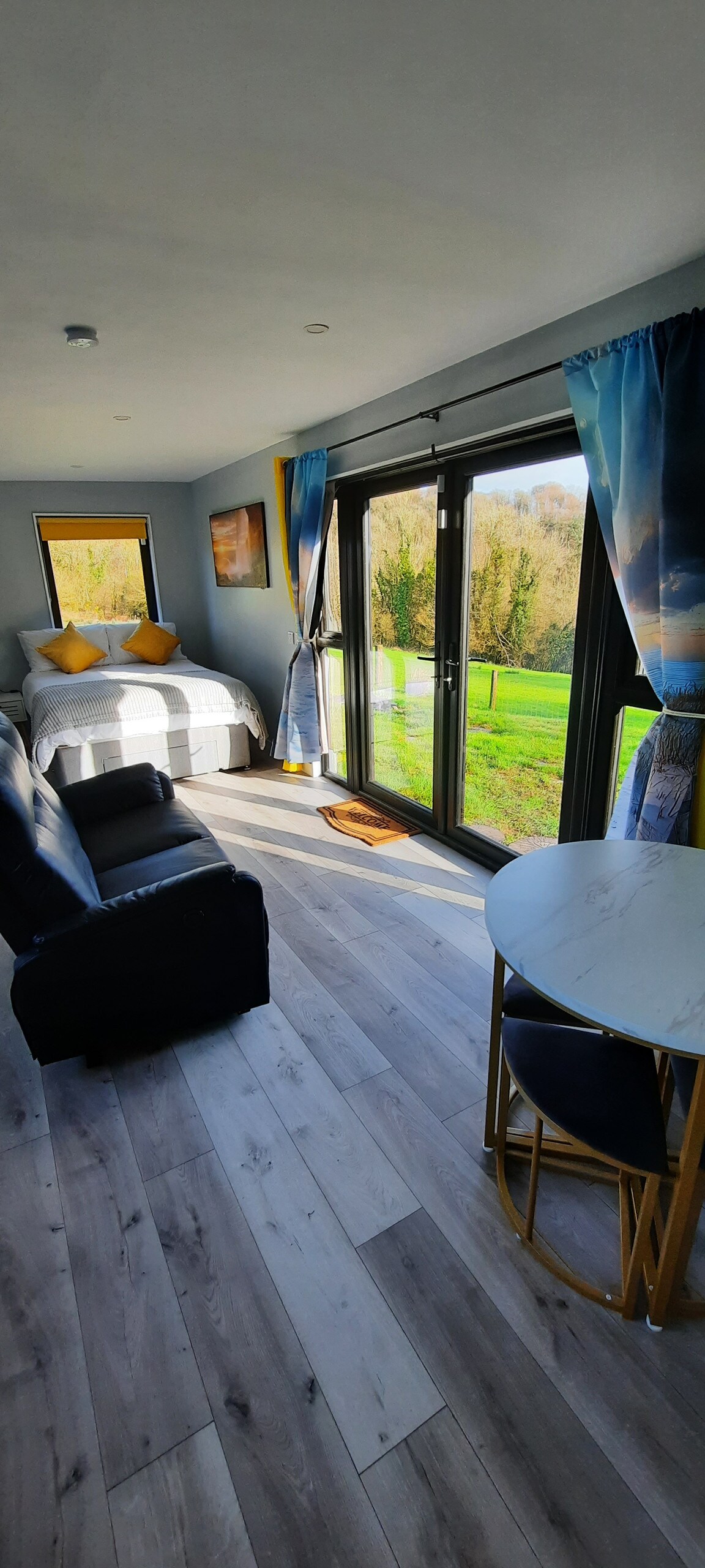 A suite attached to a unique modern two-storey property located in an area of outstanding beauty in a peaceful area with nature in abundance. Your accommodation overlooks the Knockmealdown mountains and consists of a double bed and fold up bed ( suitable for child / adults). You have an ensuite shower room, plus sofa, table/ chairs, and fridge, toaster , tea and coffee facilities. NOTE : There are no cooking facilities. Continental breakfast is included, and will be placed in your fridge