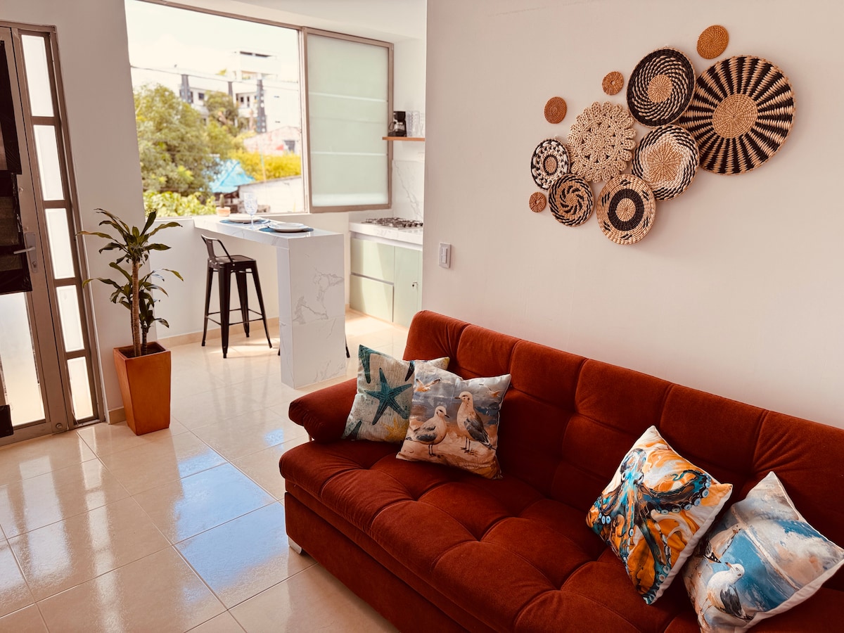 Estrena apartaestudio moderno de 39 m² con Wi-Fi de velocida100 Mbps,ideal para trabajar o relajarte. Decoración clara y espacios funcionales, a pasos de la playa y rodeado de cafés y tiendas.Perfecto para parejas o teletrabajadores que buscan lo mejor del Caribe colombiano Equipado con todo lo necesario: aire acondicionado,cocina integralConUtensilios,nevera,TVde42” lavadora. Ubicado a 800 m de la playa y a 150 m de la vía principal,lo que facilita el acceso a transporte público o carro propio.