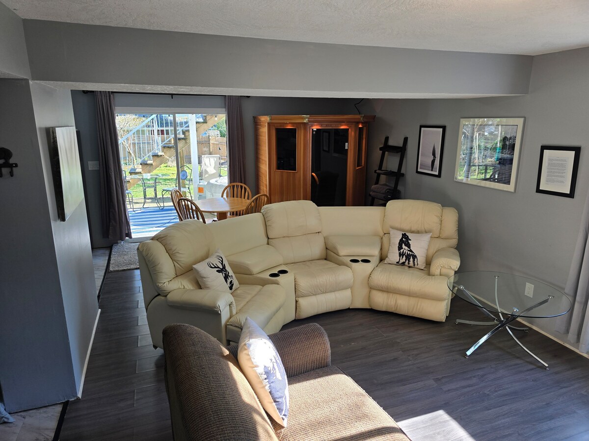 🌟 Rated 4.97★ with 500+ reviews — top 1% guest suite in Langford/Victoria! Peaceful 2BR hilltop retreat with private hot tub, NHL-style media room, gym & BBQ patio. Valley/garden/mountain views with eagles, deer & 30+ hummingbirds. Fully stocked kitchenette (Ninja oven, griddle, Keurig), Smart TVs, fast WiFi. Pet-friendly with extras. Walk to shops, pubs & trails. Free parking and self check-in. Hosts live upstairs and are available if needed.