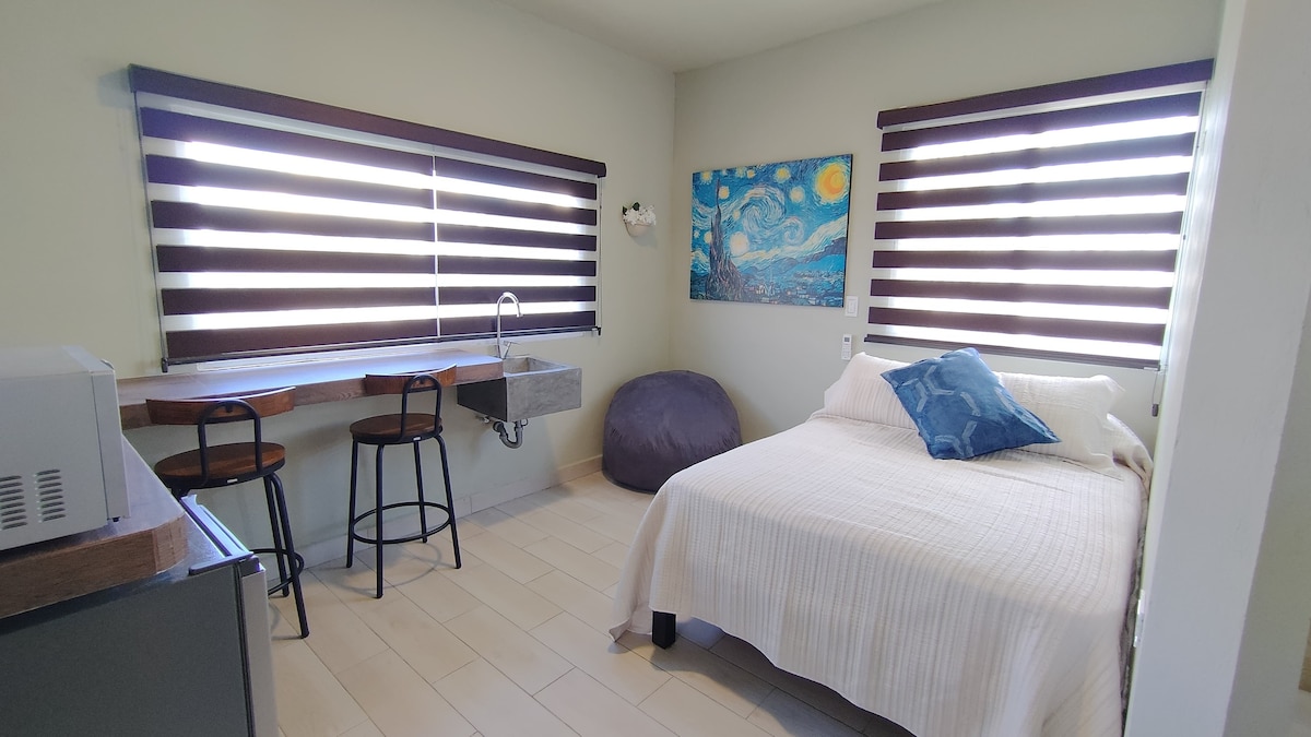 Estudios independientes con un toque de buen gusto , anexos a Casa Machetes, cuentan con una linda terraza común para disfrutar de los atardeceres y darte una refrescada en la piscinita. Cada estudio tiene una cama tamaño king , armarios amplios , cocineta equipada con refri, parrilla , micro , utensilios y cafetera. Agrégale Aire acondicionado, ventilador y Tv smart. Cuentan con un pequeño balcón con plantas para el gusto de fumadores. Ven y vive la experiencia de estar en Casa Machetes.