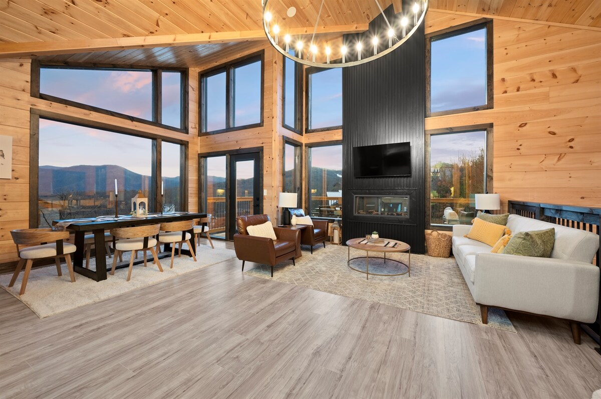 ¡Descubre por qué esta cabaña está en el Top 5% en Airbnb! ¡Hermoso, a 1 milla de Parkway y la isla! 2 espaciosas suites King Master para una noche de descanso. ¡2 baños privados completos, sofá cama, sauna, jacuzzi, sala de juegos y chimenea! MUCHAS comodidades. Te encantará este nivel abierto de 1 nivel y 3 juegos de puertas francesas al balcón privado. Relájate en el porche delantero con vistas al valle o disfruta del jacuzzi en el gran espacio del patio trasero. La sala de estar tiene techos altos y una acogedora chimenea para un retiro.