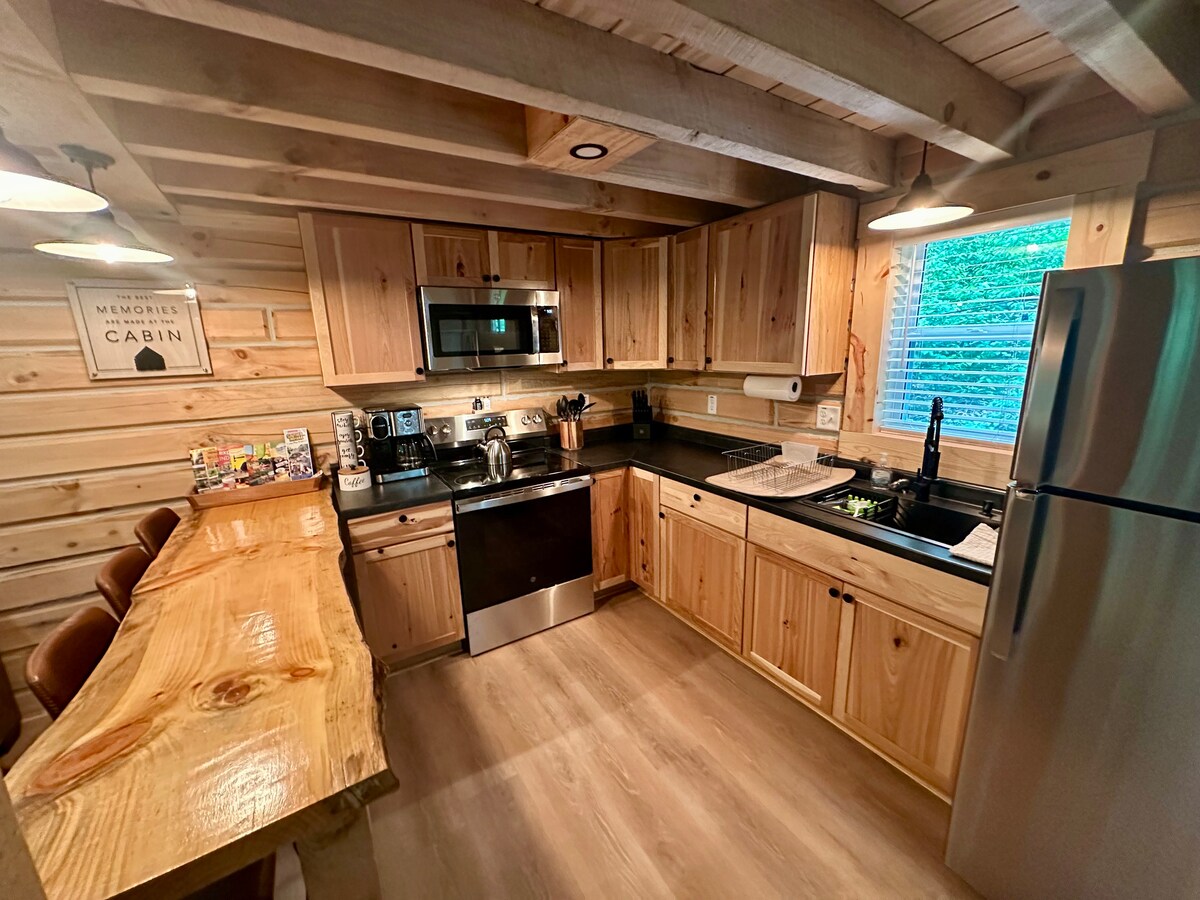 Cabaña de madera recientemente remodelada con almohadas, sábanas y toallas nuevas. Propiedad arbolada junto al arroyo. Disfruta de la proyección en el porche delantero o en la terraza trasera con Swimspa de 14 pies, chimenea y parrilla en un entorno tranquilo y boscoso. El pase gratuito del parque estatal ahorra $ 7 días. Abajo principal con cama tamaño king. 2 camas tamaño queen en el dormitorio tipo loft. Chimenea eléctrica con 5 configuraciones, aire acondicionado/calefacción, wifi/Internet de alta velocidad, TV INTELIGENTE con barra de sonido Bluetooth, Direct TV, lavadora/secadora. Máquina de hielo. SIEMPRE OFRECEMOS CHECK-IN Y CHECK-OUT ANTICIPADOS CUANDO ESTÁN DISPONIBLES.