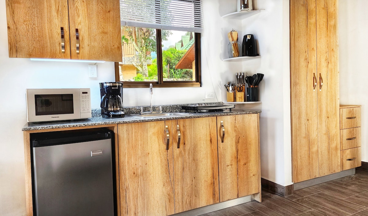 Very modern and spacious. Room includes its own terrace with private entrance ! Beautiful view of pond with Baru Volcano as background. The perfect place to enjoy your morning cup of coffee listening to birds. You have your own private fridge,stove top, a small counter top oven , microwave and coffee maker in your suite! Plus all the basics ( coffee, salt, pepper, olive oil , etc), pots and pans. Come enjoy and relax in this so romantic place! We also have high speed internet !