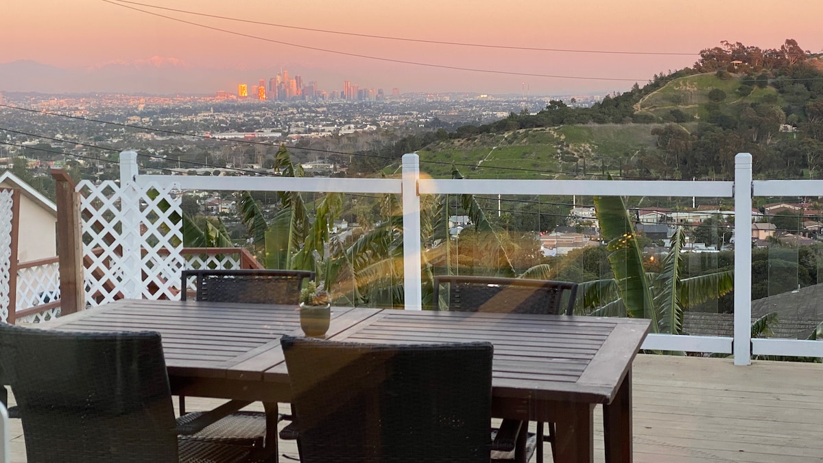 VISTAS increíbles de todo Los Ángeles. Esta casa de 2 dormitorios en Hilltop cuenta con un diseño abierto y un enorme patio. Tiene un montón de senderos al aire libre para disfrutar. Ubicado en la cima de las colinas de Blair, junto al sendero panorámico de Baldwin Hills, centros de visitantes y naturaleza. Cerca del tren subterráneo del metro a Santa Mónica y al centro de la ciudad, a 15 minutos de la playa y LAX. 36 escaleras arriba desde el área de estacionamiento privado de 2 autos en la calle. Entrada cerrada. Muy tranquilo y seguro. Wifi de 750 mbps. Muebles viejos y cómodo sofá grande. Retiro tranquilo.