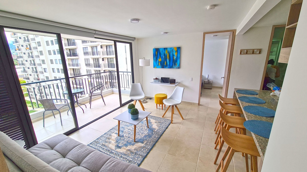 Magnifico apartamento con espectacular vista, completamente dotado. Dos habitaciones cada una con aire acondicionado. Wifi, Smart TV en sala y habitaciónes con las aplicaciones de Streaming (Ingresar con sus propias cuentas debido a las políticas de las plataformas), BBQ gas natural en balcón, hamaca. Conjunto con jacuzzi, piscinas, tenis de mesa, billar pool, futbolín, gimnasio. Complejo deportivo con canchas de tenis, futbol 5, cancha múltiple, parque infantil e iglesias