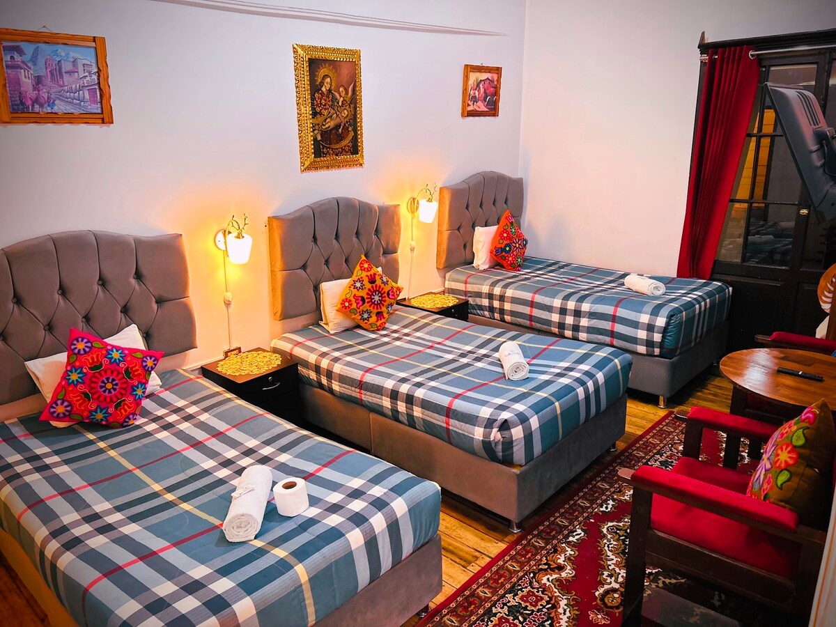 Disfruta de una estadia agradable en un lugar con muy buen ambiente y sobre todo seguro . Ubicado en el corazon del Centro de Cusco a menos de media cuadra del Mercado de San Pedro y de la estacion de tren de San Pedro, fácil acceso a tiendas atractivos turisticos y de la Plaza de Armas. Habitacion con Smart Tv, Internet de alta velocidad, Baño privado con agua Caliente garantizada las 24 horas del dia.
