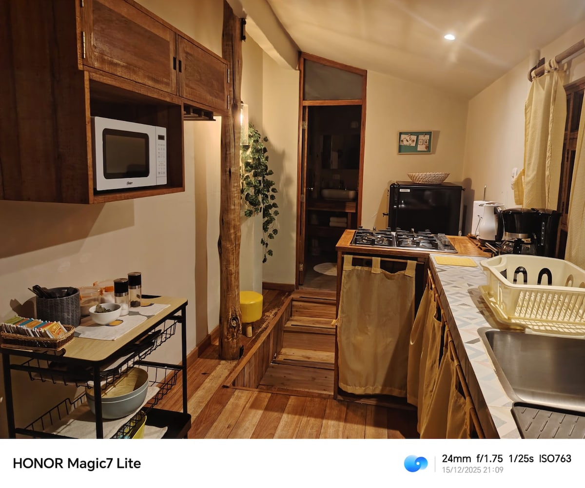 La casita esta ubicada al comenzar un bosque donde encontraras la tranquilidad que necesitas, además, cuenta con todo lo necesario para brindarte unos días de descanso te conectaras inmediatamente con la naturaleza, y sobre todo disfrutaras de los espacios de manera privada; si necesitas trabajar contaras con internet 800 Mgbts. una cama Queen que te permitirá descansar confortablemente, además contamos con una ducha española con agua caliente todo el tiempo y una tina medicinal.