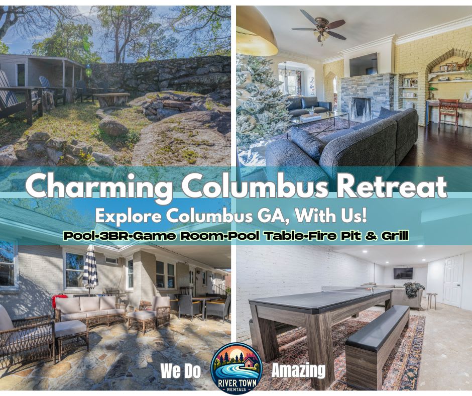 Centrally located Historic Family Retreat 13min to Ft Moore, 5min to Downtown! This 4BR/2.5BA home in Columbus blends timeless charm with modern amenities, comfortably hosting up to 12 guests. Enjoy a private pool, firepit, and game room, plus a fully equipped kitchen for family meals. Nestled in a peaceful neighborhood, it's minutes from Columbus' top attractions, dining, and shopping. Whether relaxing by the pool or exploring local history, this home offers the perfect getaway for family fun.