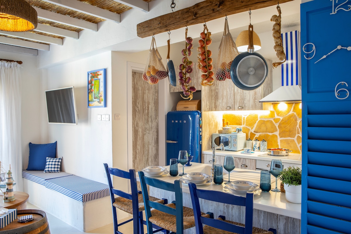 A solo 50 metros de la playa, Lemnos Suite (50 metros cuadrados), con su única, temática, decoración de lujo, transmite un entorno atmosférico y relajante, típico de las islas griegas. Ofrece un sabor auténtico de Grecia mientras visitas Chipre. Con una exquisita sala de estar abierta con sofá cama (para 2 personas), una cocina totalmente equipada, un colchón Cocomat en una base de hormigón y una ducha a ras de suelo, puede alojar hasta 4 adultos (o 2 adultos+2 niños). Se puede agregar cuna / trona a pedido.