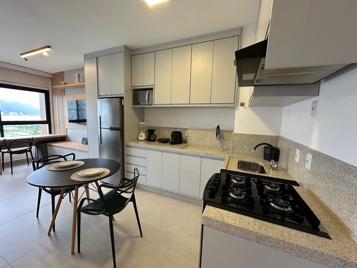 Flat aconchegante, moderno e recém construído situado a 300 mts da praia, e a 50 metros do centrinho de Juquehy. Possui 1 suite + 1 banheiro social, sala e cozinha americana equipada. Ar condicionado, wifi e TV em todos os ambientes. Serviço de praia incluso nas estadias com cadeiras de praia, guarda sol e mesinha.