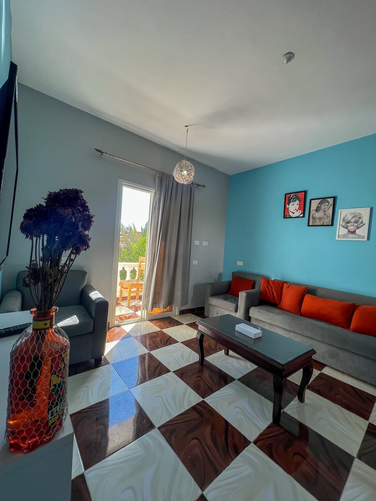 Centrally located by the Assala beach and near all the cool spots, this apartment is 2 minutes from a supermarket, ATM, pharmacy, cafés, and restaurants. It offers high-speed internet, a king-sized bed, air conditioning, 2 couches, a table, chairs, a kitchen, a bathroom, and an outdoor area. There are 3 security cameras outside. Mixed couples with at least one Egyptian must provide a marriage certificate; this doesn’t apply to foreigners only.