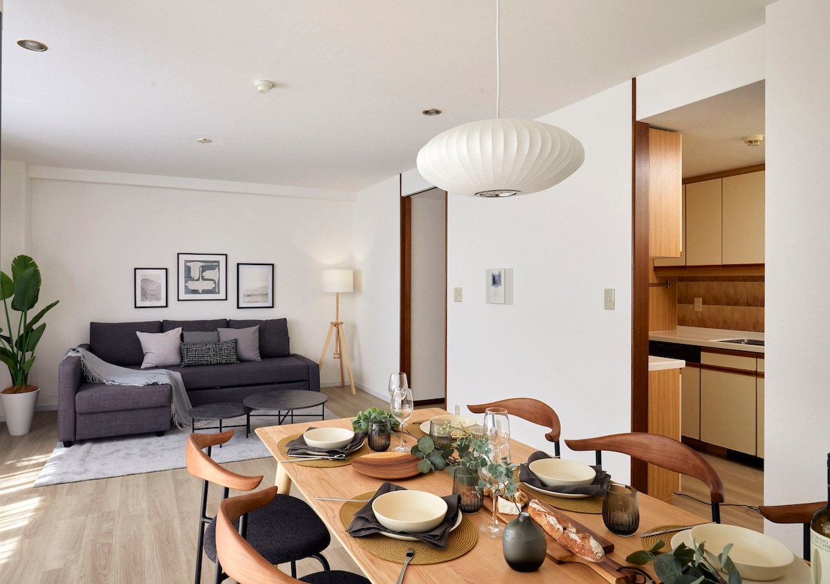 Experimenta una mezcla única de diseño escandinavo y japonés en esta casa renovada de dos pisos de 86 años en Sangenjaya. Con 80 ! (900 pies²) de espacio luminoso, un techo de 3 metros y un espectacular techo de 7 metros sobre la cocina, es perfecto para familias y grupos pequeños. A solo 6 minutos de la estación y a 4 minutos de Shibuya, la casa ofrece la mezcla perfecta de calma y comodidad de la ciudad en uno de los vecindarios más queridos de Tokio, Sangenjaya.