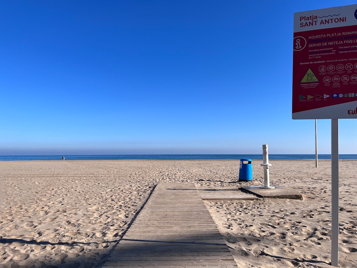 Apartamento en la playa en primerísima línea, muy acogedor y luminoso, en una playa maravillosa y muy tranquila y a sólo 10 Km de la bulliciosa Cullera por si en algún momento quieres marcha.Con unas vistas maravillosas y una decoración ligera y muy agradable. Se encuentra a 28 km de Valencia y 7 Km de Sueca. Os daremos una tarjeta para que podáis acceder al club con pistas de Tenis y piscina. También hay un polideportivo con pista de futbito y padel. ¡¡¡¡Bienvenidos a nuestra casa!!!!