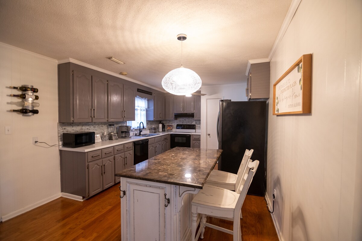 ¡Te damos la bienvenida a Dothan's Gem! ¡Una casa de ensueño bellamente diseñada! ¿Traes a toda la familia? ¿Trabajas a distancia? Ten la seguridad de que tendrás Internet de alta velocidad pase lo que pase, ¡con velocidades de hasta 500 Mbps! Si bien hay mucha privacidad, esta ubicación te permite moverte fácilmente. Estás a solo: A 4 minutos del Flower's Hospital A 5 minutos del parque recreativo Westgate A 5 minutos de Forever Wild Trails. A 10 minutos del corazón del centro de Dothan. A 1,5 horas de PCB ¡Y rodeado de los mejores restaurantes de Dothan!
