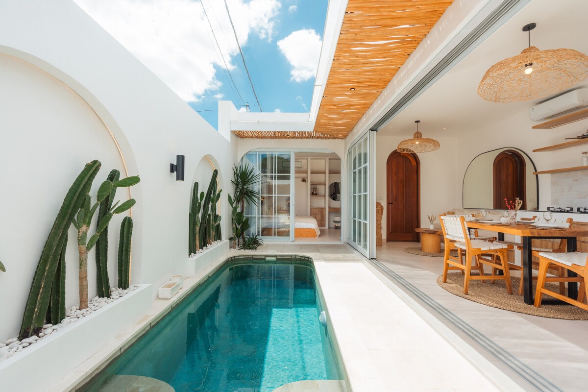 Despiértate en tu propia villa de inspiración mediterránea, perfecta para parejas o viajeros solitarios que buscan una escapada elegante en Bali. La amplia suite principal cuenta con una cama tamaño king y baño privado, mientras que la luminosa sala de estar, el acogedor comedor y la cocina totalmente equipada hacen que sea fácil sentirse como en casa. Sal a tu piscina privada y a tu exuberante salón de jardín, completo con sofá y vegetación tropical, tu propio refugio tranquilo.