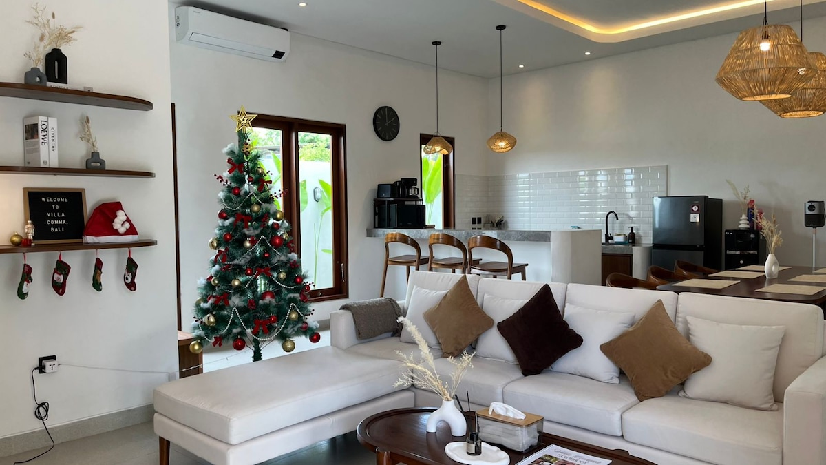 🌴 Welcome to your private 3BR villa in Canggu 🌴 With just a 3-minute walk to cafés and 5 minutes to Beach & La Brisa. Each bedroom has an ensuite bathroom and dedicated desk, ideal for both rest and remote work Enjoy a large private pool, tropical garden, and BBQ. The bright living area is fully air-conditioned, with a smart projector and board games for cozy nights in With fast WiFi, filtered water, and a full kitchen, this villa is the perfect base for families, friends, or digital nomads