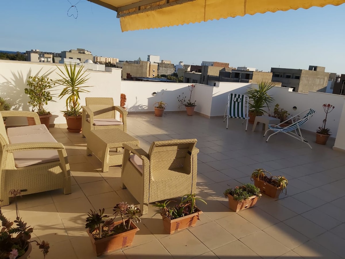 Apartamento con aire acondicionado + WiFi ilimitado con una hermosa terraza sin vecinos, muy luminoso y cómodo. Ubicado cerca de todos los servicios: supermercado Monoprix, pescadero, mercado típico, comida rápida, restaurantes, cafeterías, lounge, Taxi... El alojamiento cuenta con WiFi ilimitado y de buena calidad. La playa y el centro de la ciudad están a 15 minutos andando. Su posición central le garantiza una proximidad a la ciudad de Nabeul sin dejar de estar protegido del ruido del centro.