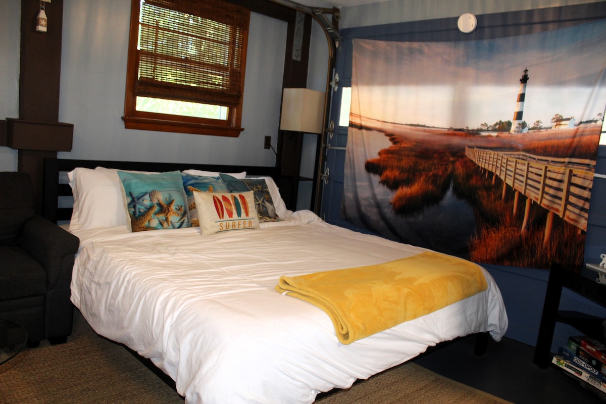 Te damos la bienvenida a Mermaid Cove Guest House, un refugio idílico en el tranquilo Currituck Sound. Esta casa de huéspedes bellamente actualizada y recién pintada es una escapada romántica perfecta, ya sea que visites en los cálidos meses de verano o en la acogedora temporada de invierno. Relájate en tu bañera de hidromasaje privada, disfruta de la lujosa cama con dosel tamaño king y aprecia las comodidades modernas, como toallas nuevas, electrodomésticos Whirlpool de calidad y un televisor Samsung 4K de 65 pulgadas. Amplia terraza privada con fogata de gas Sillas y tumbonas al aire libre
