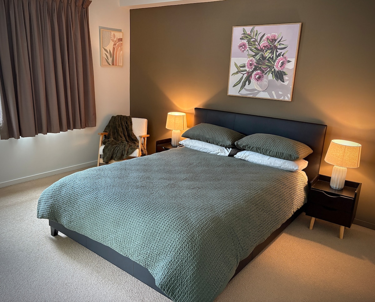 Our furnishings are clean and simple. Tv,cd player,bbq,tv in main bedroom, main bedroom can be split to two king singles also or one double bed,dishwasher,oven,hotplate,plenty of plates & kitchen gear, linnen provided. Main couch also opens up to sofa bed. airconditioned, ceiling fans,washing machine and dryer or clothes rack. mirrored wardrobes with draws. Kitchen table for six. Underground secure carpark. Bathroom with shower in bath and toilet . Also a second toilet.