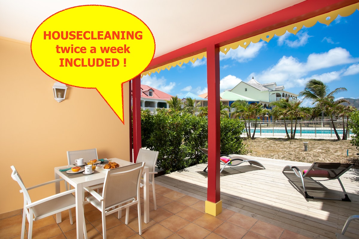 Es un acogedor estudio grande con cama tamaño king, sofá cama tamaño queen y un gran balcón, está en el segundo piso del Royal Islander Club Resort La Terrasse en Maho, totalmente equipado y amueblado. Situado justo delante de la playa de Maho Bay y a pocos minutos a pie de la playa de Mullet Bay. Hay pocos restaurantes y boutiques como tiendas de puros, joyerías y una tienda de belleza. Casino Royale está justo al lado. También hay un supermercado para comprar comestibles, una farmacia, una clínica y mucho más...