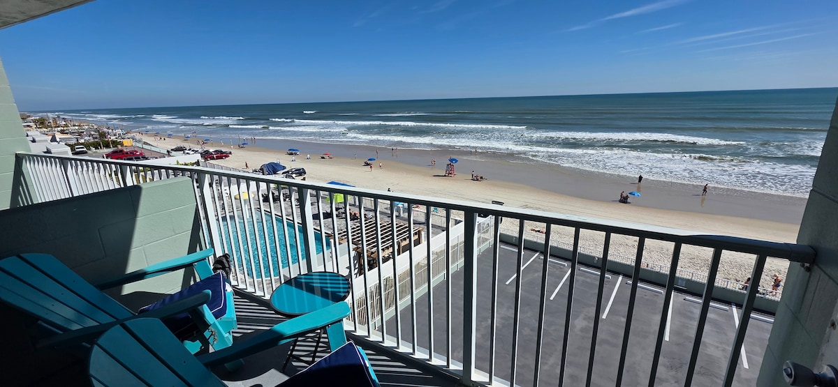 *** ¡La nueva piscina y el acceso a la playa están abiertos!*** ¡Te damos la bienvenida a Daytona Beach Bliss! Disfruta de nuestro estudio recién renovado a pocos pasos de la playa. Ubicado en Daytona Beach Club, este acogedor estudio tiene capacidad para 4 personas con una cama tamaño queen y un sofá cama. El espacio es el más adecuado para 2 adultos o una familia con 2 adultos y 1-2 niños. El balcón del quinto piso tiene una hermosa vista lateral al mar y a la ciudad.