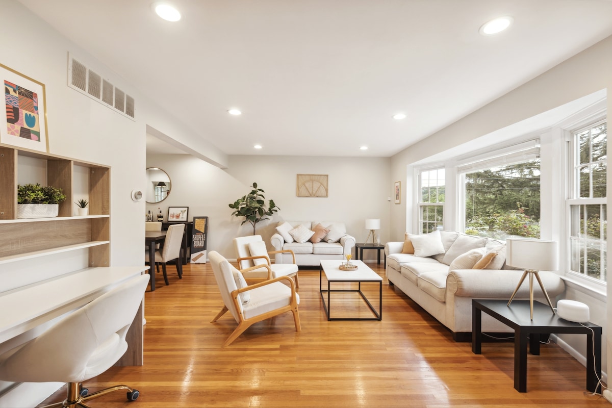 Bienvenido al Chill Pad Deluxe, organizado por Brandon y Hannah, ubicado en un encantador barrio de Cherry Hill, Nueva Jersey. Esta impresionante casa ofrece un refugio cómodo y práctico para tu estancia en la zona. Al entrar, serás recibido por un interior amueblado diseñado pensando en tu comodidad. La espaciosa sala de estar cuenta con lujosos asientos y tres acogedoras habitaciones, lo que te permite relajarte y desconectar después de un largo día de exploración o trabajo en la ciudad.