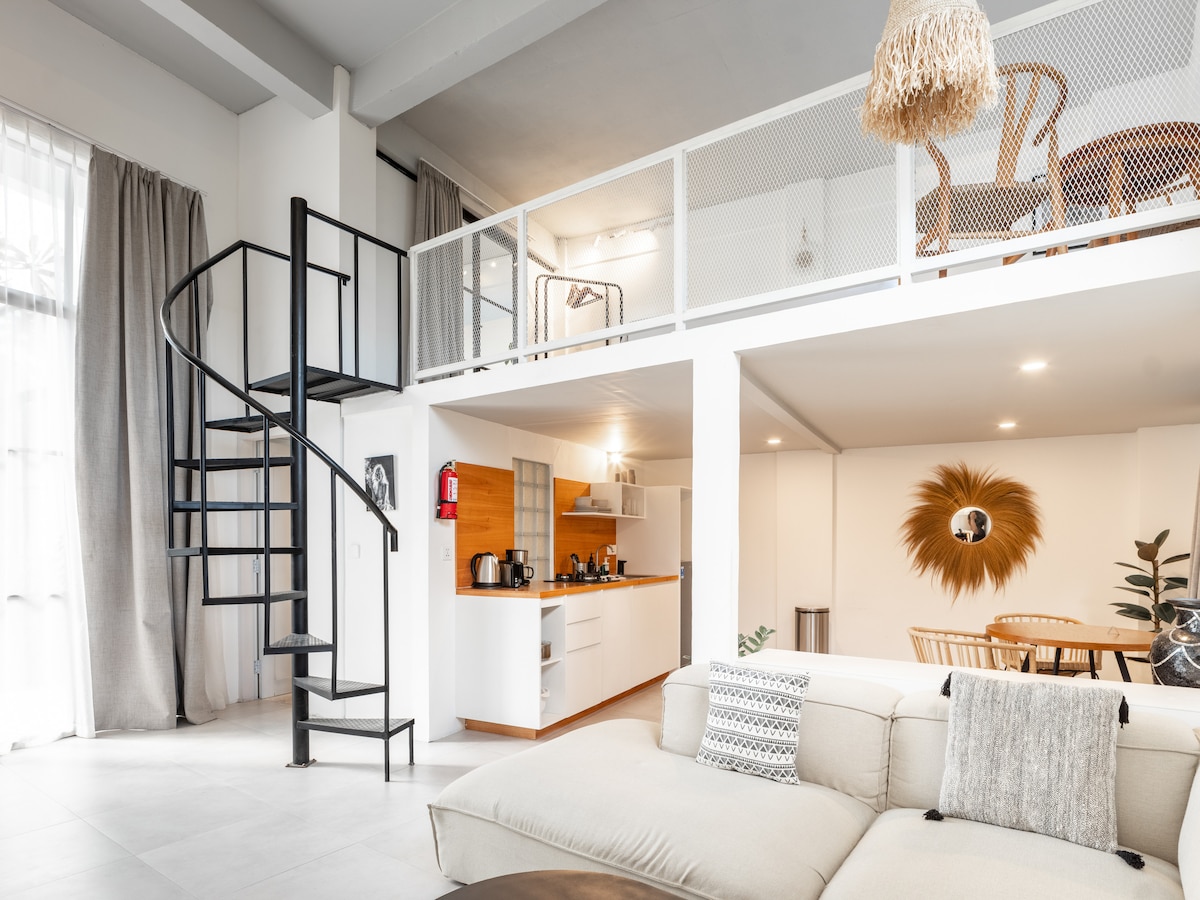Rasakan perpaduan sempurna antara gaya dan kenyamanan di mezzanine loft bertema industri yang dirancang sebagai apartemen compact, terletak dekat dari Pantai Sanur dan pusat kota. Cocok untuk pasangan, pelancong solo & digital nomad. TV pintar 50 inci, Fast WIFI sampai 400mbps & tempat tidur sofa yg nyaman di ruang TV. Dapur lengkap & teras belakang pribadi. 7 menit ke Pantai Sanur 7 menit ke Grand Lucky/Pepito supermarket 7 menit ke Rumah Sakit Internasional Bali 40 menit ke Bandara Ngurah Rai