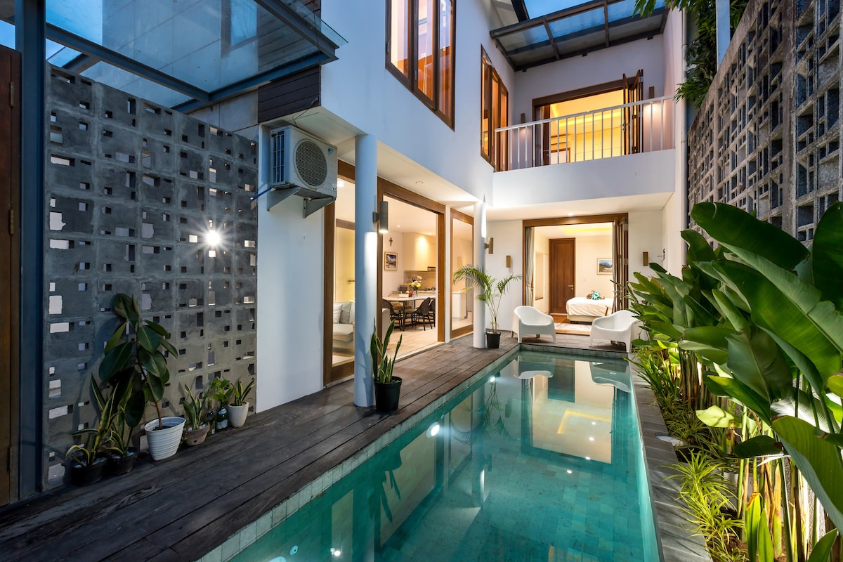 Una villa privada inspirada en el arte moderno ubicada en Sanur. Situada en un barrio residencial con vistas a un campo de arroz local y al monte Agung. Una escapada única y relajante. La villa ha sido diseñada y decorada para que tu estancia en Bali sea única y relajada. Sumérgete en el clima balinés mientras abres las puertas de tu propio centro vacacional y disfrutas de la reclusión de tu villa privada con una gran piscina privada de 8 m x 3 m con cenador junto a la piscina y tumbonas. Todo ello en tus propios y exuberantes jardines tropicales amurallados.