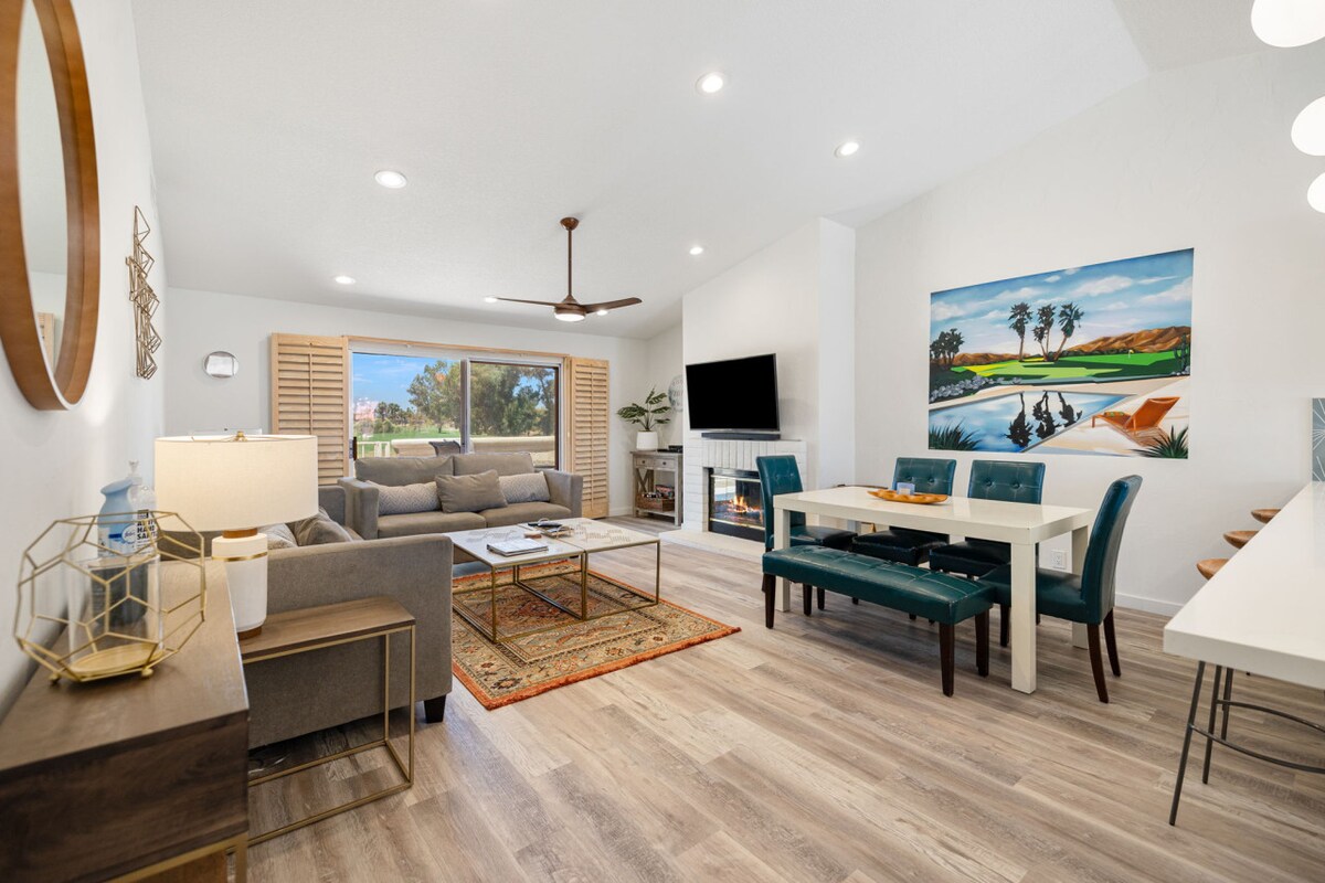 This colorful, contemporary 2BR/2BA lower-level condo is your perfect Palm Desert retreat 🌴. Steps from a sparkling pool + hot tub, the space is fully furnished with everything you need to relax and recharge. Enjoy sunset mountain views from the back patio, gathered around the fire pit in your own private, lush oasis 🔥⛰️. We love furry friends 🐾. A $150 non-refundable pet fee per pet is added at booking. A Pack ’n Play + high chair are also available in-unit for little ones.