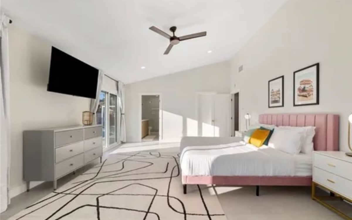 Bienvenido a Palm Peach, una fiesta en el desierto inspirada en Wes Anderson llena de colores y personajes, perfecta para 8 huéspedes. Toma el sol en tumbonas hechas a mano junto a la piscina en un patio trasero estilo resort. Sumérgete en la gran piscina de agua salada. Disfruta de un spa caliente bajo las estrellas. O reúnete alrededor de la chimenea para evitar los escalofríos. Experimenta una sala de juegos y teatro con luz negra única con un mural de luz negra, una mesa de billar de 8 pies, karaoke, juegos de Los Simpsons y mucho más.